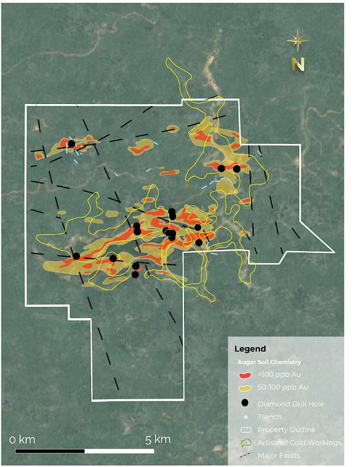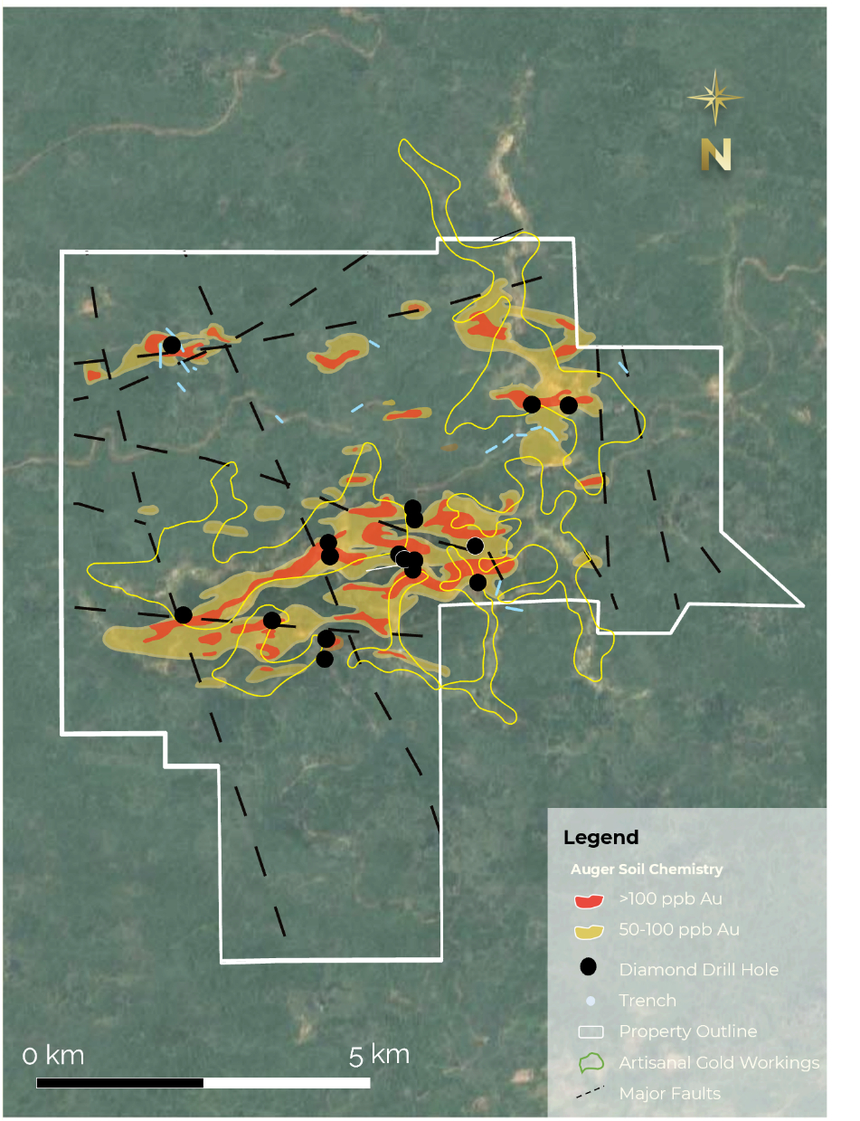 The property is host to a northeast-trending deformation zone host to high-grade quartz veins, with coincident geophysical and geochemical anomalies covering 4 by 8 km. The area has returned 100,000 oz Au of artisanal production from surface oxide and high-grade vein zones. The Fish Creek property is less than 10 km from Golden Shield’s Arakaka property. Only limited shallow drilling has occurred at Fish Creek (2,870 m) but drilling intersected widespread low-grade gold haloes surrounding high-grade deformation zones. The property remains largely undrilled.